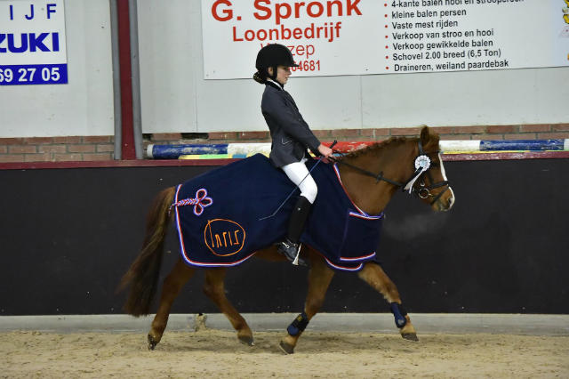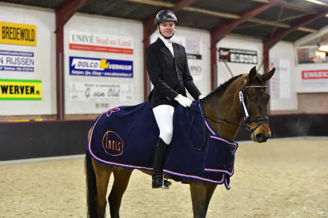 Kimberly werd op woensdag 2x eerste met 209 en 211 punten. In de finale deed ze er nog een schepje bovenop, ze wonnen de finale in de klasse M (M1 + M2) met een percentage van 74,50 % (221,5 en 225,5 punten)! Dit was de hoogste score van de avond en daarmee wonnen ze de Turfhorst Bokaal!