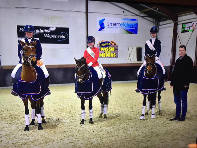 Afgelopen woensdag en donderdag werd de Turfhorst Bokaal verreden in Wezep. Dit was een dressuurwedstrijd over 2 proeven met een finale op donderdagavond. Van Klein Maar Dapper deden drie combinaties mee aan deze wedstrijd en alle drie mochten ze meedoen aan de finale! Dit waren Amber Vriesema met Summer (klasse B), Bertil Platte met Donau NM (klasse M1) en Kimberly Pap met Pippins Playboy (klasse M2).